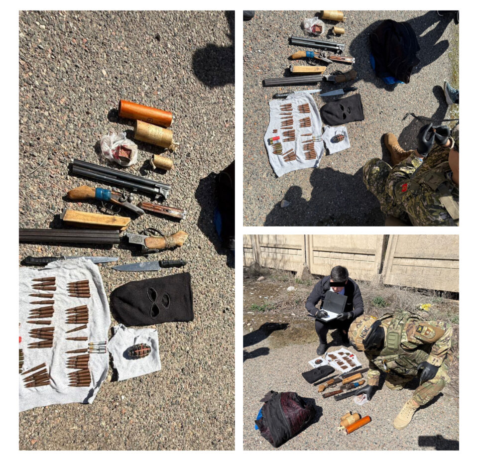 Атайын кызматтын маалыматына ылайык, жеринен 2 кесилген мылтык, 2 мина, 1 өзүн-өзү жардыруучу түзүлүш, 1 граната, тротил, 1 бет кап, 2 бычак, 3 жандыргыч жана ар кандай калибрдеги патрондор табылып, алынган.