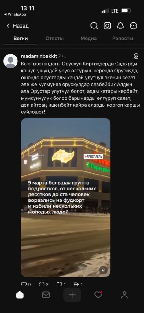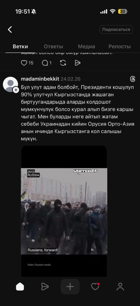 По данным спецслужбы, установлен и задержан пользователь фейкового аккаунта «Madaminbekkit» — гражданин КР 1995 года рождения, который размещал посты и комментарии деструктивного характера.