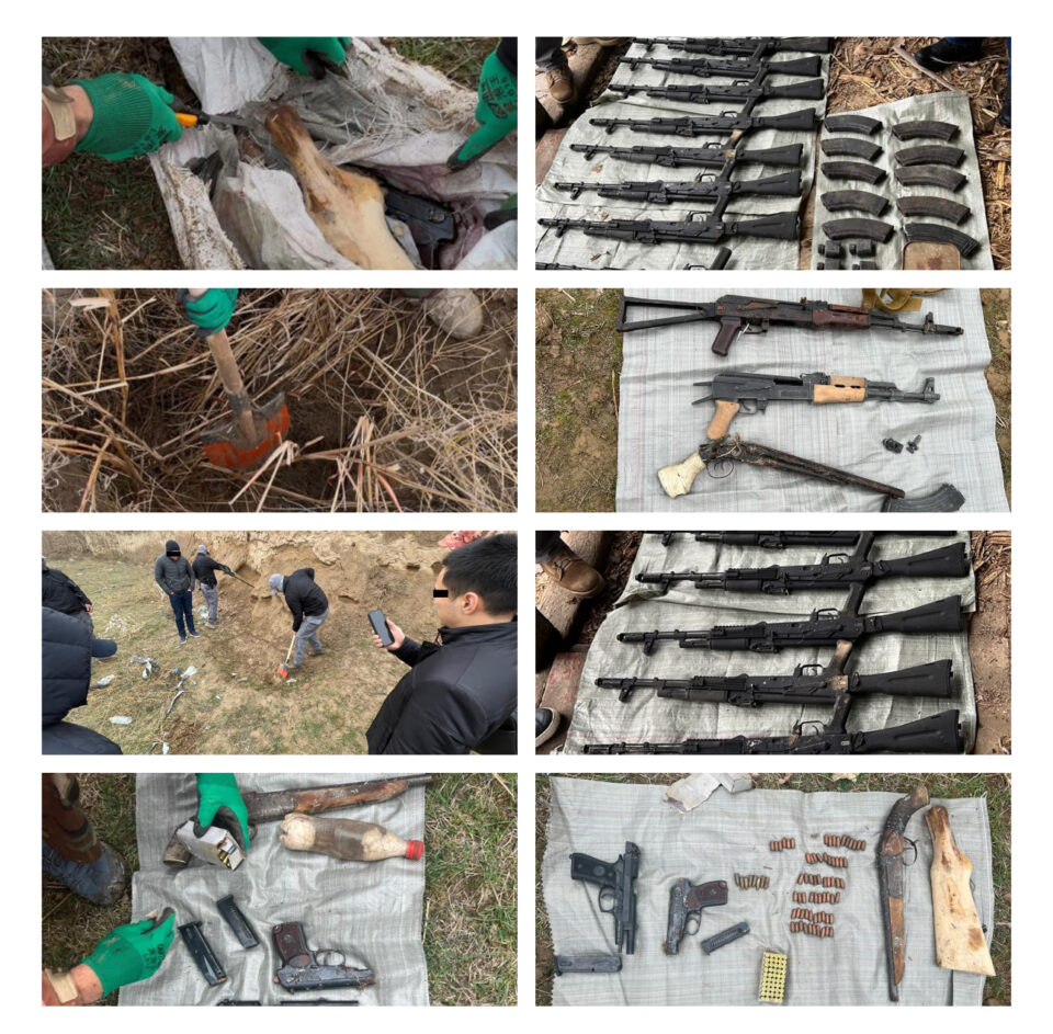 ГКНБ Кыргызской Республики в ходе оперативно-розыскных мероприятий по пресечению деятельности организованных преступных группировок в Ошской области обнаружил крупный схрон огнестрельного оружия и боеприпасов.