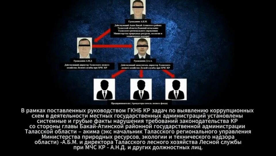 По версии следствия, аким Бакай-Атинского района (бывший начальник Таласского регионального управления Министерства природных ресурсов, экологии и технического надзора) А.Б.М., директор Таласского лесного хозяйства Лесной службы МЧС А.Н.Дж., а также другие лица в 2022–2023 годах организовали коррупционную схему по незаконному предоставлению в рекреационных целях земельных участков с выгодным расположением вдоль центральной трассы въезда в город Талас, относящихся к владениям государственного лесного фонда, гражданам М.Н.И. мерою 3,2 га, К.у.Ч. мерою 3 га, А.Г.А. (супруга главы Бакай-Атинского района) мерою 2 га и С.М.Т. мерою 1,2 га, где последними были капитально построены зоны отдыха.