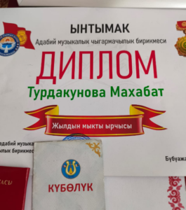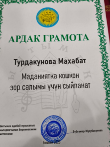 “Бири акын, бири ырчы – эл тараза, эл сынчы” аттуу адабий музыкалуу кечесинин уюштурган “Ынтымак” адабий музыкалык чыгармачылык бирикмесинин жетекчиси, коомдук ишмер, журналист Бүбүажар Жусубакуновага терең ыраазычылык билдиребиз! “Ынтымак” адабий музыкалык чыгармачылык бирикмеси мындан ары да чыгармачыл инсандарды эл алдына алып чыгып, өнөрлөрүн даңазалай берсин! Иштерине ийгиликтерди каалайбыз! – дейт ырчы, актриса, куудул Махабат Турдакунова.